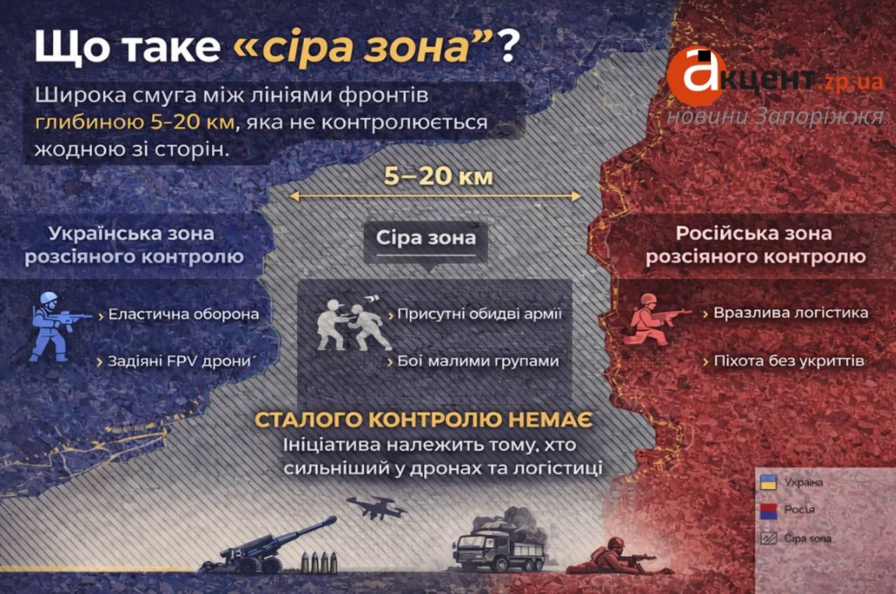 Між українськими та російськими позиціями на фронті існує не просто лінія зіткнення, а широка «сіра зона» глибиною до 20 кілометрів. Саме вона дедалі більше визначає хід бойових дій, зокрема на Запорізькому напрямку, де українські сили вибудували глибоку, гнучку систему контролю території.