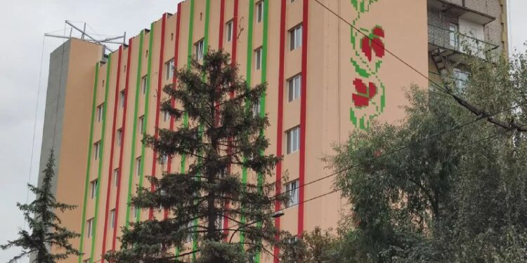 Так, на общежитии №4, которое находится по улице Железнодорожной, появился мурал на всю высоту 9-этажного здания. Рисунок выполнен красным и зеленым цветами, изображая цветки на растении. Кому-то данный рисунок может напомнить вышиванку.