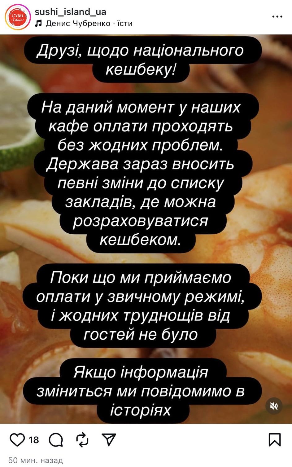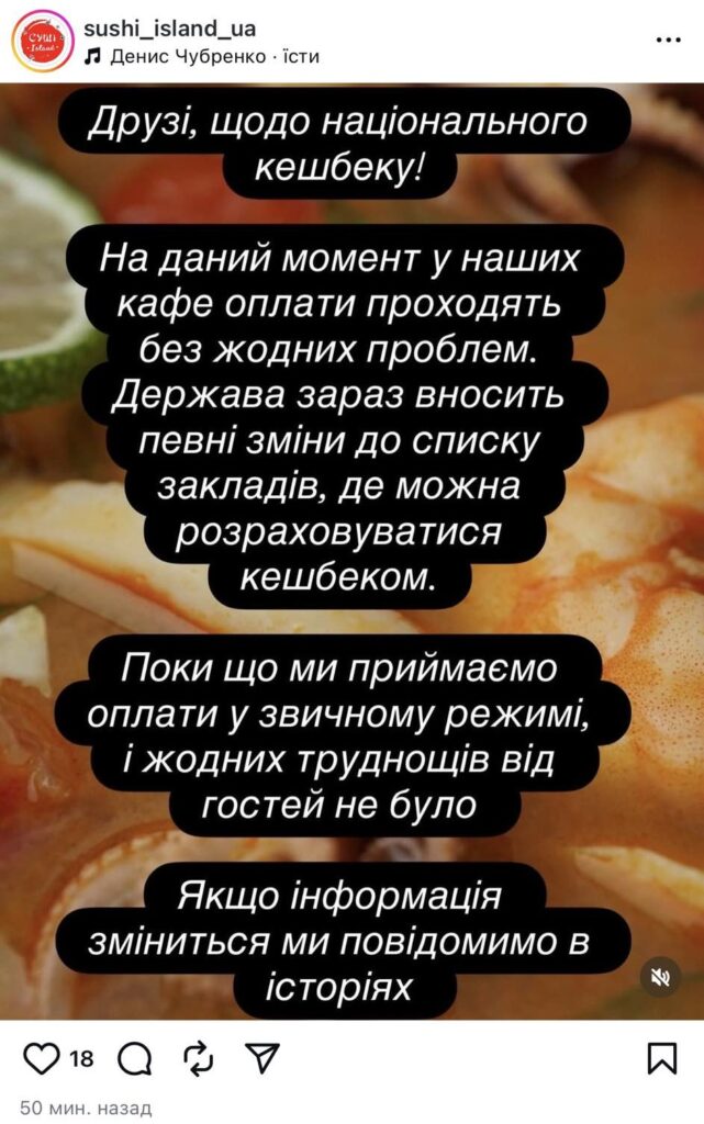 Оскільки рішення про зміни категорій тільки ухвалили, деякі оплати досі проходять. Наприклад, запорізький заклад СушіАйленд повідомив на своїй сторінці в Інстаграм, що їхні клієнти сьогодні без проблем розраховували нацкешбеком. Тож, мабуть, оновлення запрацюють найближчими днями.