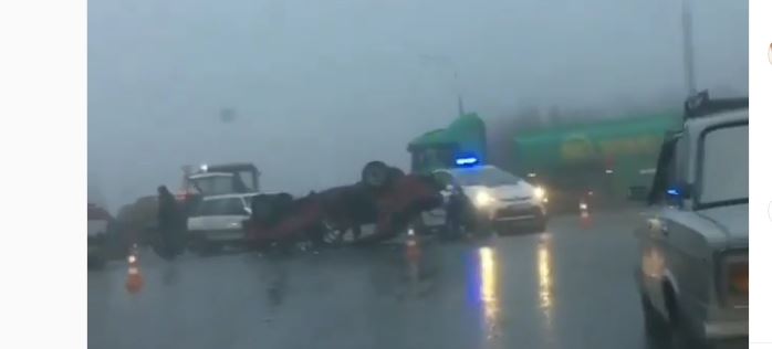 Как видно на видео, посередине дороги находится перевернутая легковушка. Часть деталей авто разбросаны по дороге, у машины оторваны двери. Очевидно она несколько раз перевернулась. Позже стало известно, что на перекрестке столкнулись ВАЗ и Рено.