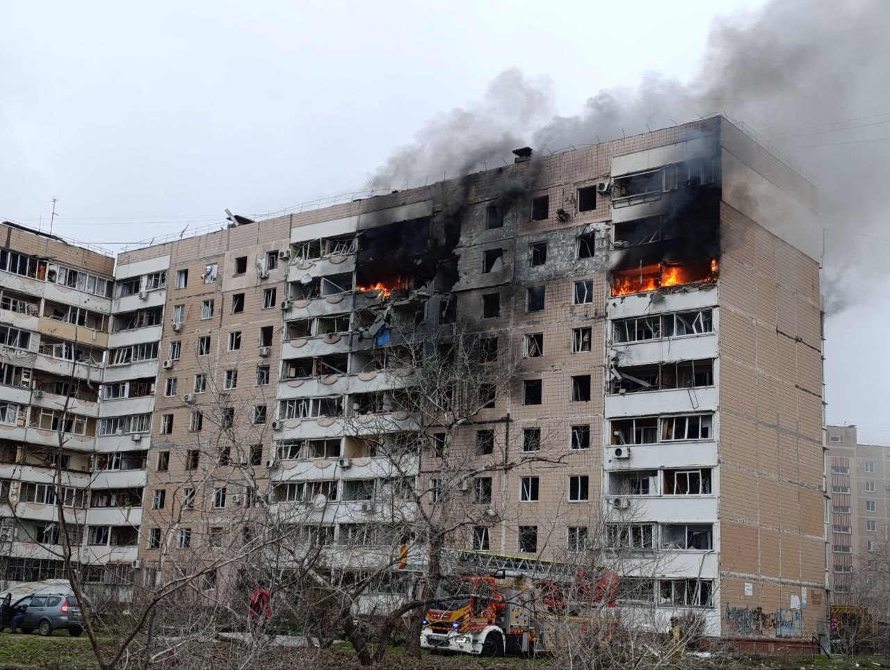 Місцеві мешканці евакуюються, рятувальники обгороджують небезпечну зону та працюють над ліквідацією пожежі. Один із постраждалих, що вижив під час обстрілу, розповідає: «Прилетіло… придавило дитину. Дитина більше не з нами». Його слова підкреслюють всю серйозність трагедії та небезпеку для мирного населення.