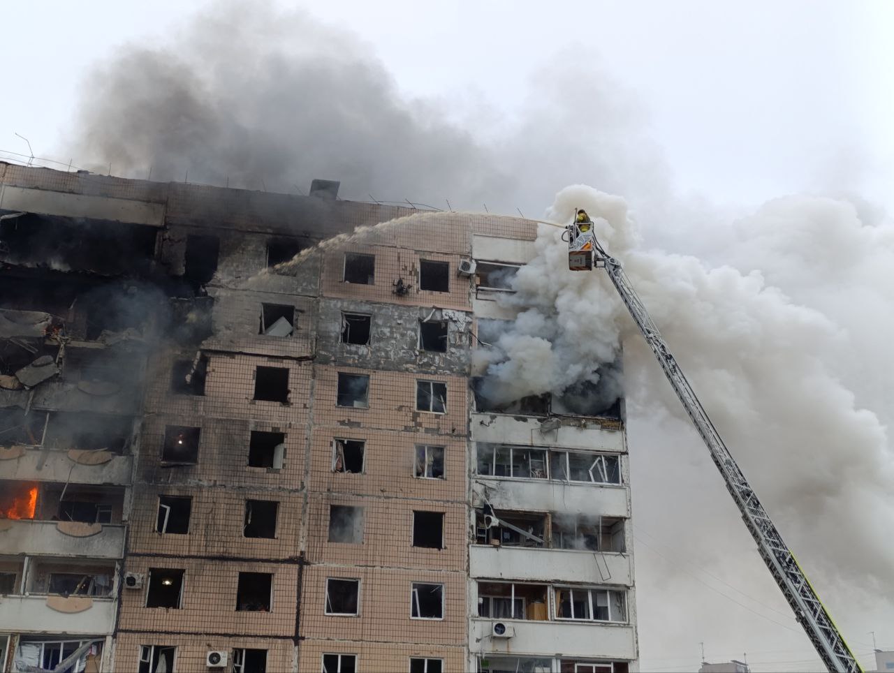 На подвір’ї лежать уламки скла, бетону та металу, рятувальники обережно перевіряють будівлю на наявність постраждалих. Попри небезпеку, деякі мешканці намагаються забрати цінні речі та документи з квартир.