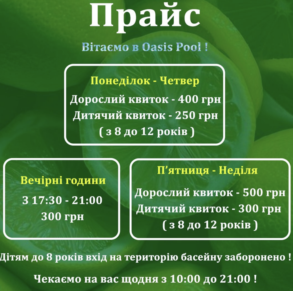 Особливо важливо: дітям до 8 років вхід на територію басейну заборонено — це окремо підкреслено у прайсі закладу.