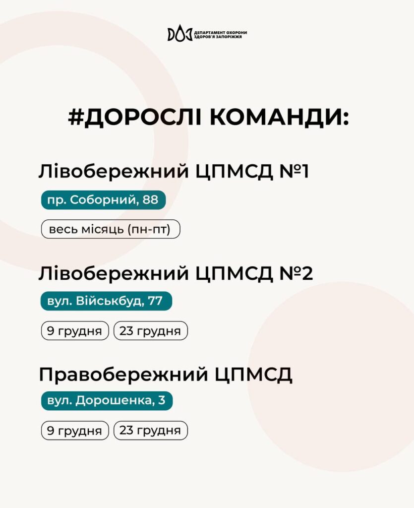 - Правобережний ЦПМСД – вулиця Дорошенка, 3. Дати 9 і 23 грудня.