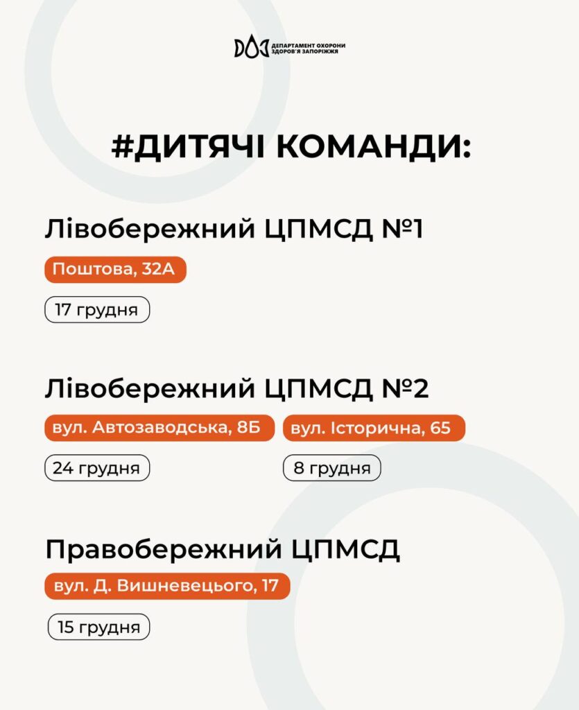 - Лівобережний ЦПМСД №1 – вулиця Поштова, 32А. Дата: 17 грудня.