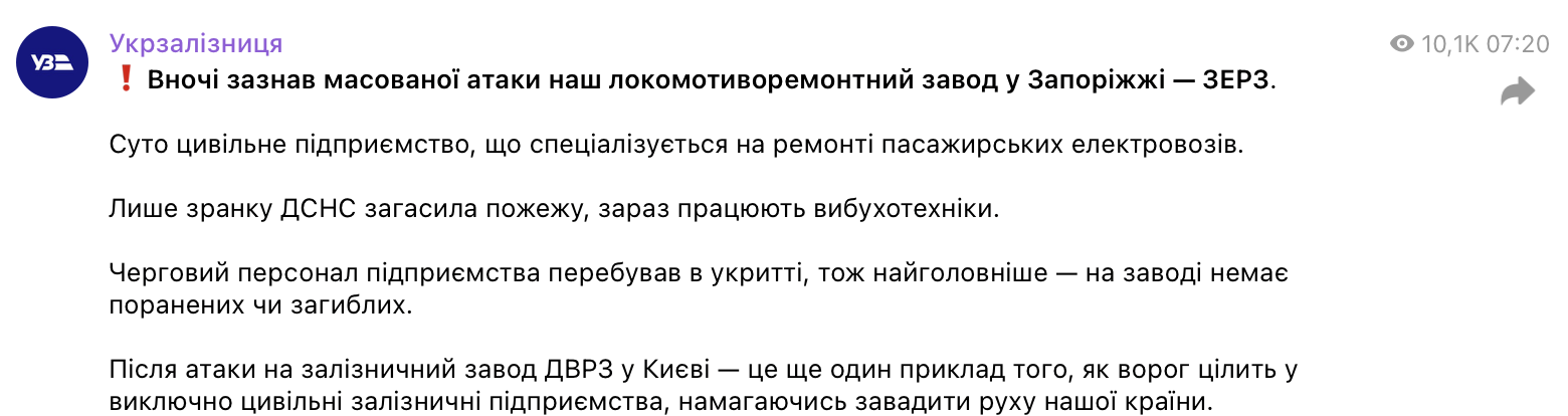 Під час нічної атаки дронами-камікадзе ворожі БпЛА влучили по цивільній інфраструктурі Запоріжжя. Одним із об’єктів, який став мішенню, виявився локомотиворемонтний завод — ЗЕРЗ. Підприємство займається технічним обслуговуванням і ремонтом пасажирських електровозів і не має жодного стосунку до військової сфери.