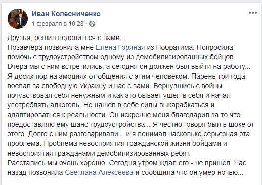 В Мелитополе ушел из жизни бывший военнослужащий. Как пишет в соцсети местный активист Иван Колесниченко, мужчина три года провел на фронте, после чего вернулся в родные края, где не смог справиться с психологическими проблемами и запил. На днях экс-боец должен был выйти наконец-то на работу, но ночью его не стало…