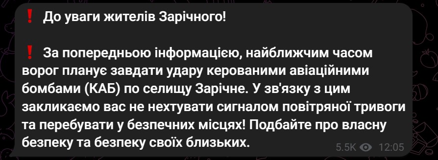 Зараз Комишуваську селищну громаду попереджують про ризик удару КАБ по Зарічному.