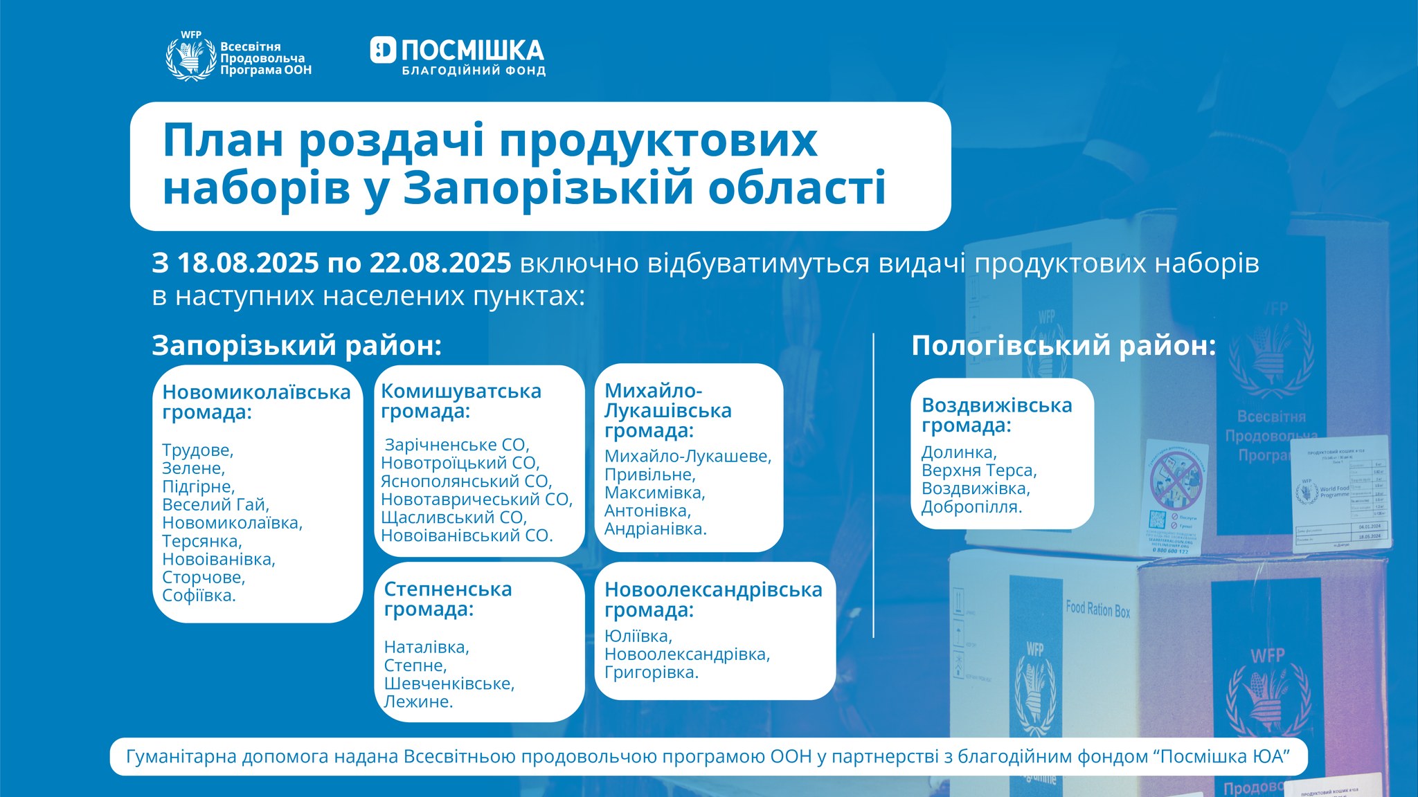 Благодійний фонд «Посмішка ЮА» повідомляє про заплановані роздачі гуманітарної допомоги у громадах Запорізької області. З 18 по 22 серпня 2025 року мешканці зможуть отримати продуктові набори від Всесвітньої продовольчої програми ООН.