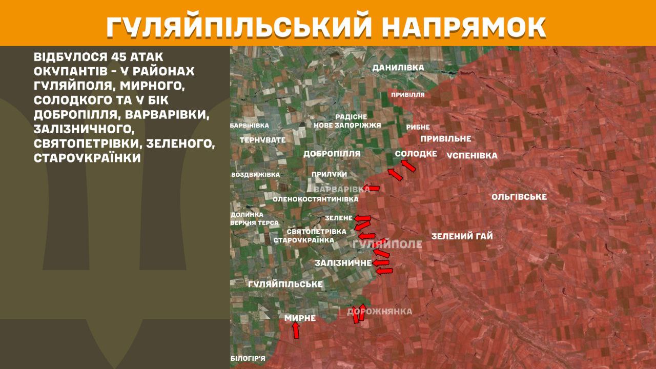 На Гуляйпільському напрямку відбулося 45 атак окупантів – у районах Гуляйполя, Мирного, Солодкого та у бік Добропілля, Варварівки, Залізничного, Святопетрівки, Зеленого, Староукраїнки.