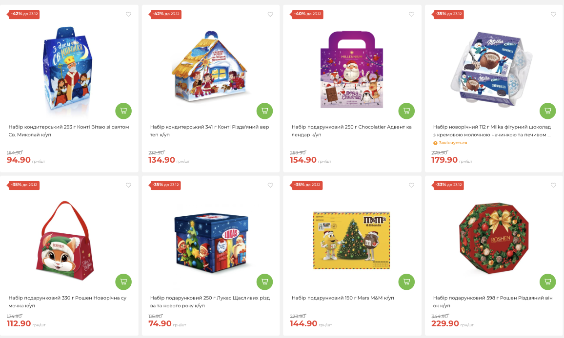 Частина новорічних наборів в АТБ продається зі знижками до 40–45%. Акційні пропозиції діють обмежений час і залежать від наявності конкретних позицій у магазинах Запоріжжя.