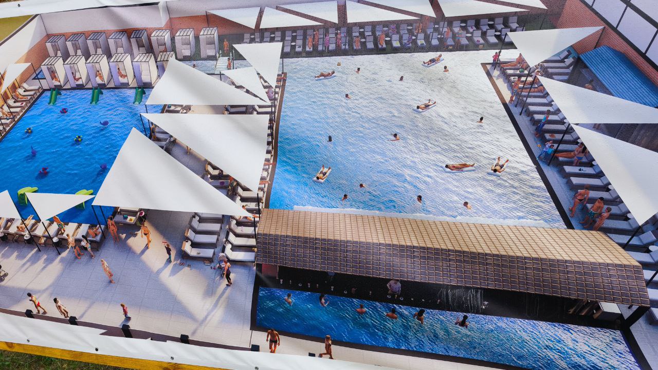 - Не обійшлося без роботи зі стінами: приблизно третина цегляної кладки другого поверху вже виконана. Водночас спеціалізована техніка формує основу для водної зони комплексу — котлован під басейни та технічні приміщення набуває потрібних контурів. Ще одна бригада займається земляними роботами під два окремі комерційні блоки, які з’являться поруч із основною будівлею.