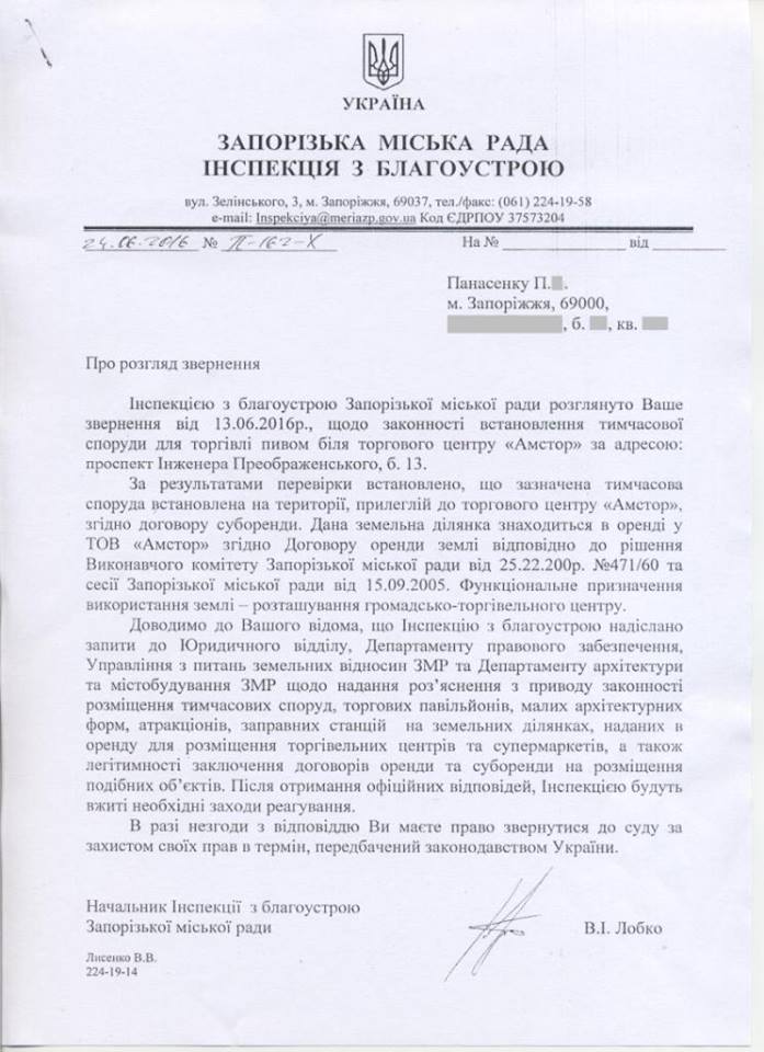 Как рассказал “Акценту” Павел Панасенко, владельцы пивной точки, видимо решили, что им достаточно договоренностей с руководством “Амстора”, потому они не получали паспортов привязки, а их сооружения не внесены в комплексуню схему временных сооружений, как того требует закон. Однако, согласно целевого назначения, данный участок может быть использован только для расположения общественно-торгового комплекса. Никаких пивных киосков там быть не может. К тому же, размещены они с нарушением – в случае чрезвычайной ситуации, к примеру пожара, доступ специальных служб ко входу в Амстор буде значительно затруднен.