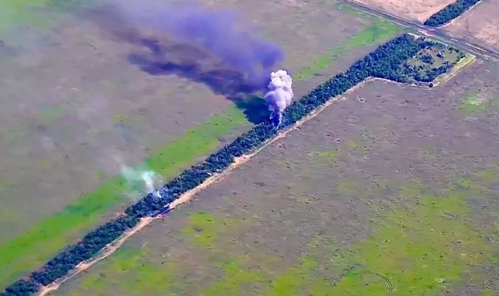 На кадрах видно, як внаслідок двох потужних ударів українських артилеристів по розташуванню російських окупантів в лісосмузі на одній з ділянок здіймається дим одразу з двох місць, при цьому, ймовірно, відбувається детонація боєкомплекту ураженого складу боєприпасів ворога.