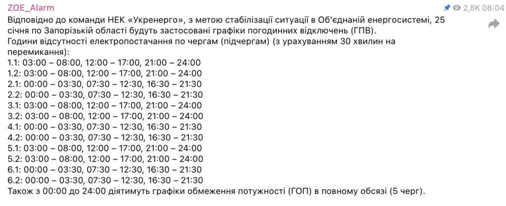 25 січня у Запорізькій області запроваджуються графіки погодинних відключень електроенергії. Рішення ухвалене відповідно до команди НЕК «Укренерго» для стабілізації роботи Об’єднаної енергосистеми України.