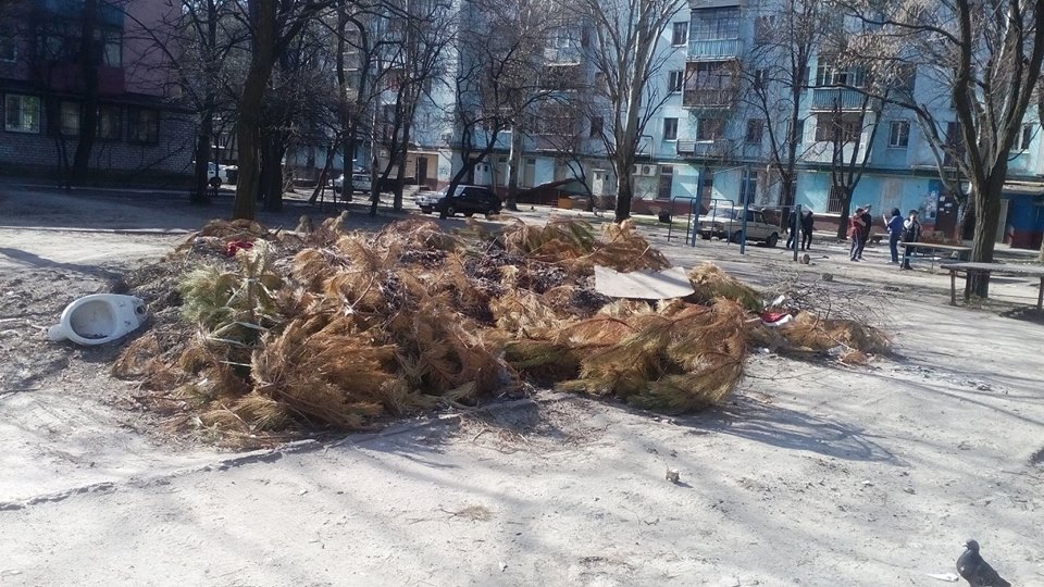 В одном из дворов Запорожья из прошлогоднего мусора и сухих елок образовалась свалка, которая может вспыхнуть в любой момент. Об этом на своей странице в социальной сети сообщила активистка Елена Еременко.
