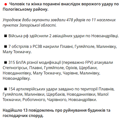 Загалом упродовж доби російські війська завдали 478 ударів по 11 населених пунктах Запорізької області. Агресор застосовував авіацію, реактивні системи залпового вогню, безпілотні літальні апарати різних модифікацій (переважно FPV) та артилерію. Під ворожим вогнем опинилися Степногірськ, Плавні, Оріхів, Гуляйполе, Малинівка, Мала Токмачка, Новоандріївка, Чарівне, Щербаки, Новоданилівка та Роботине.