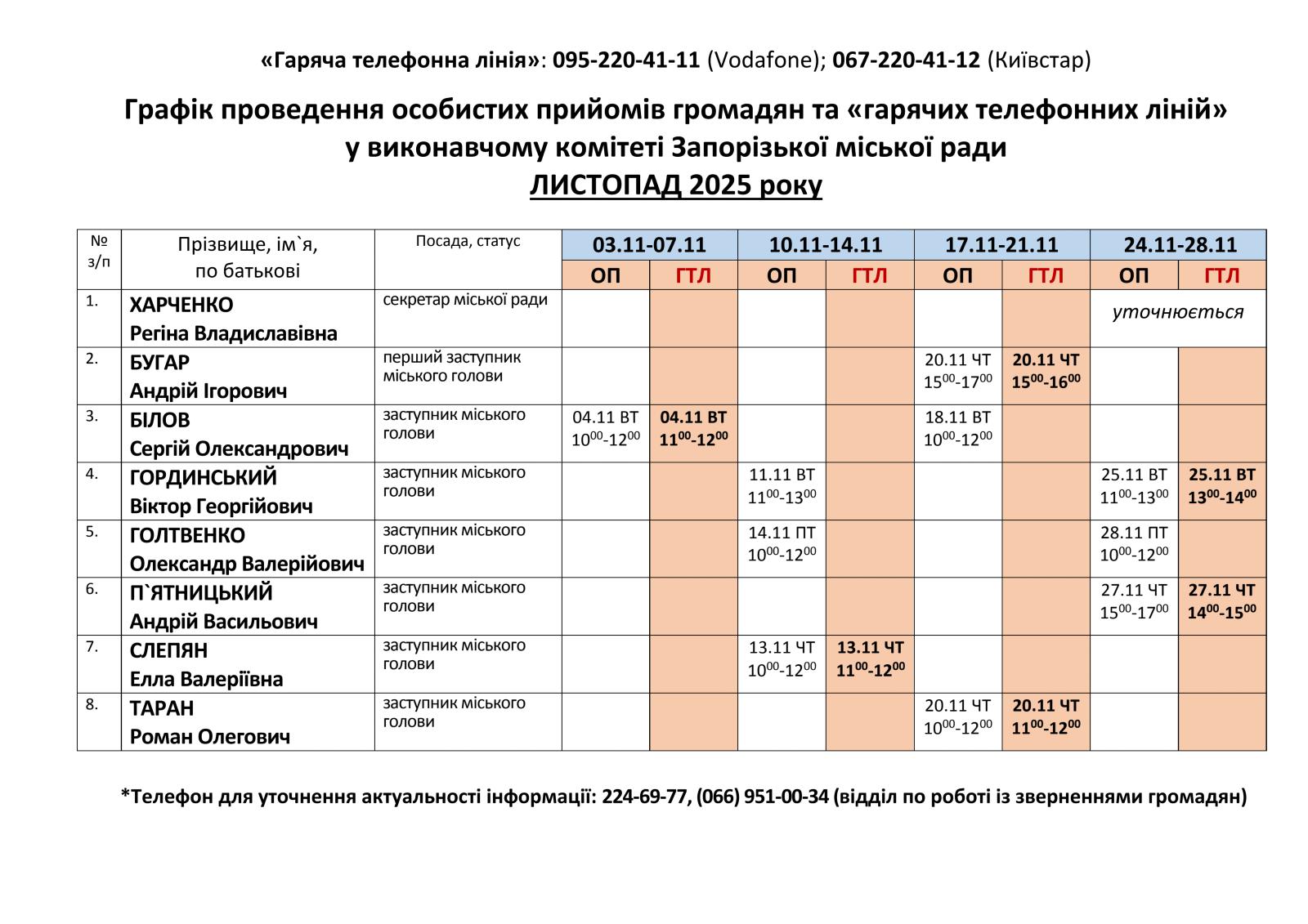 На листопад у Запорізькій міській раді заплановане проведення особистих прийомів, «гарячих» телефонних ліній за участю секретаря міської ради, заступників міського голови.