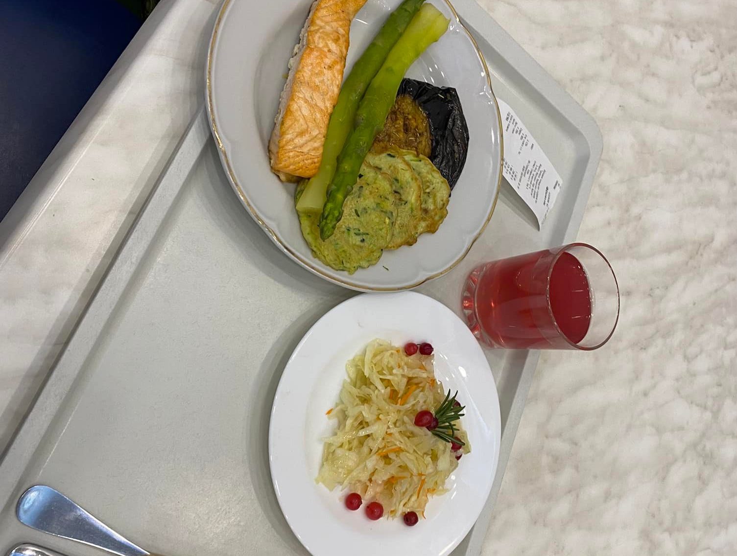 Небольшая порция квашенной капусты – 42 гривны, компот – 19, филе семги – 208, овощи гриль -140 гривен.
