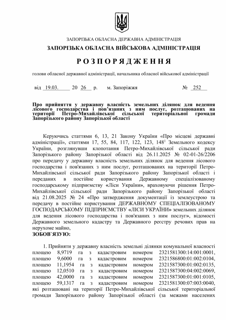 У Запорізькому районі шість земельних ділянок лісового фонду передали з комунальної у державну власність. Відповідне розпорядження підписав голова Запорізької ОВА Іван Федоров.