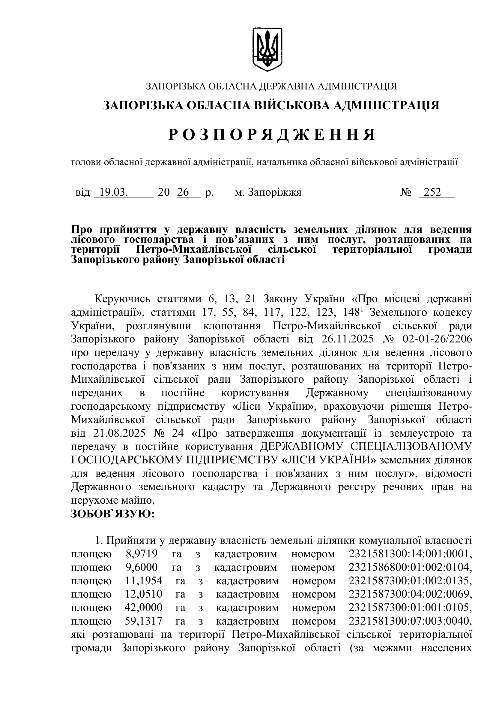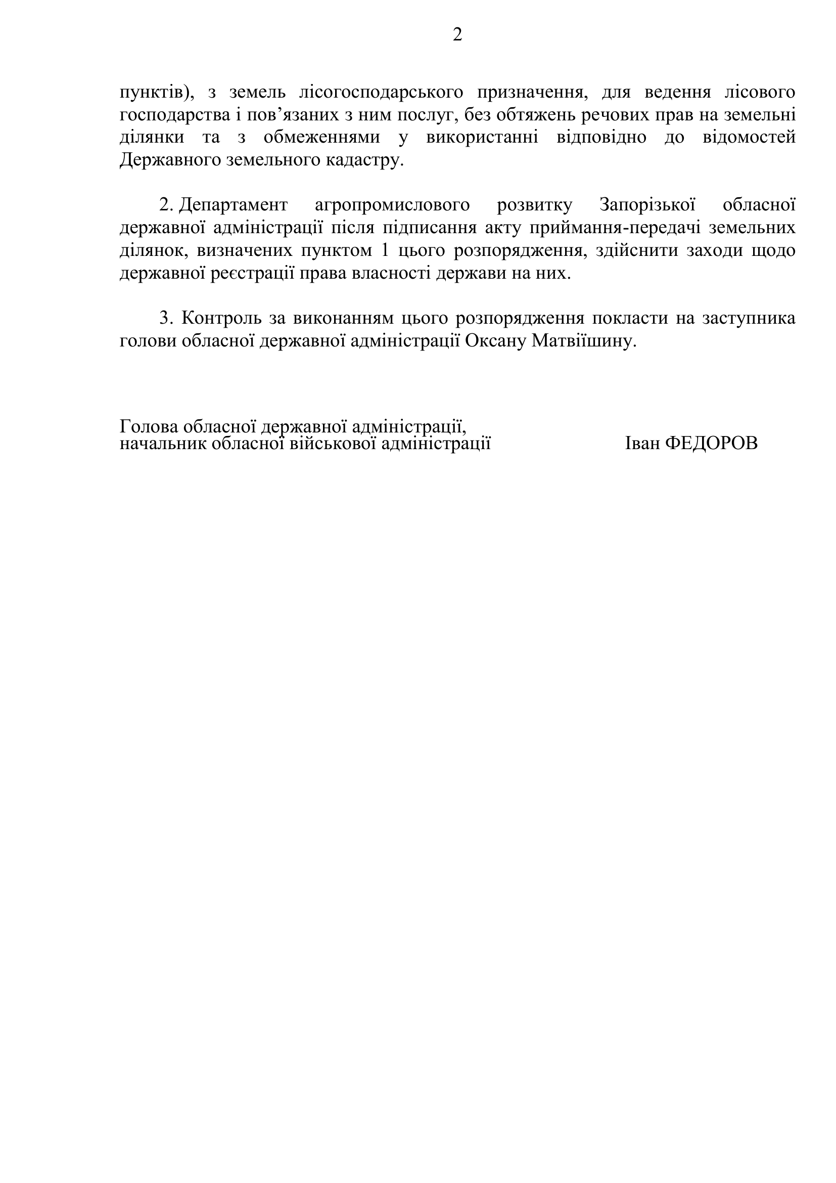 У Запорізькому районі шість земельних ділянок лісового фонду передали з комунальної у державну власність. Відповідне розпорядження підписав голова Запорізької ОВА Іван Федоров.