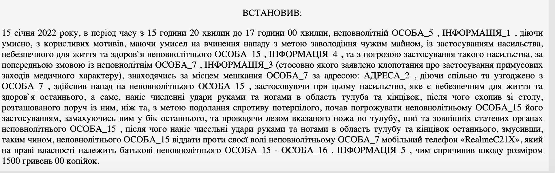 Під час перебування у будинку група підлітків била потерпілого, вимагала гроші, принижувала та знімала все на відео. Один із них погрожував ножем, інший — знімав на телефон і підбурював до ще жорсткіших дій. Згідно з вироком, злочини мали корисливий і принизливий мотив — нападники забрали мобільний телефон потерпілого і намагалися змусити його сплатити вигаданий «борг».