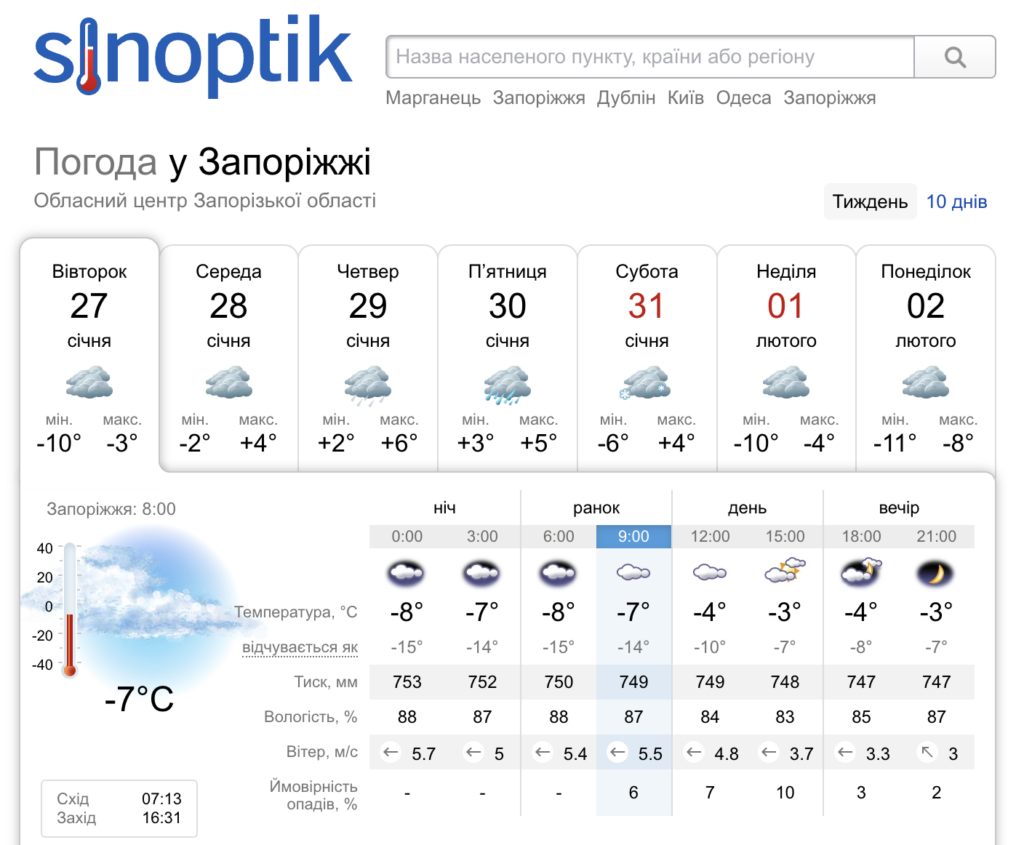 За прогнозами синоптиків, у середині тижня температура повітря в Запоріжжі підніметься до +4…+6° вдень. У цей період можливі опади у вигляді дощу з мокрим снігом, а також підвищена вологість повітря.