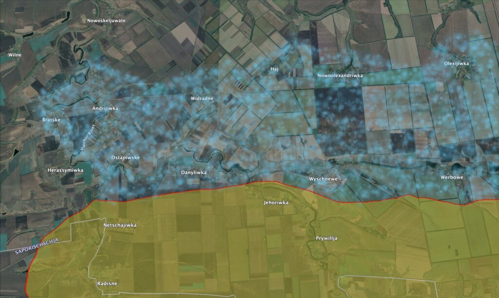 Українські сили з початку лютого ведуть тактичний наступ на північному фасі Гуляйпільського фронту — на стику Запорізької та Дніпропетровської областей. За супутниковими знімками Sentinel-2, ключові бої зосереджені навколо панівних висот, контроль над якими відкриває шлях до Успенівки та Темирівки.
