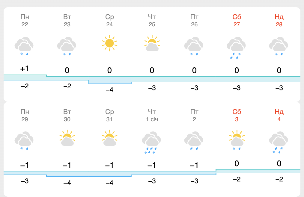 - 4 січня (нд): 0° / −2°, перехідні опади — дощ зі снігом.
