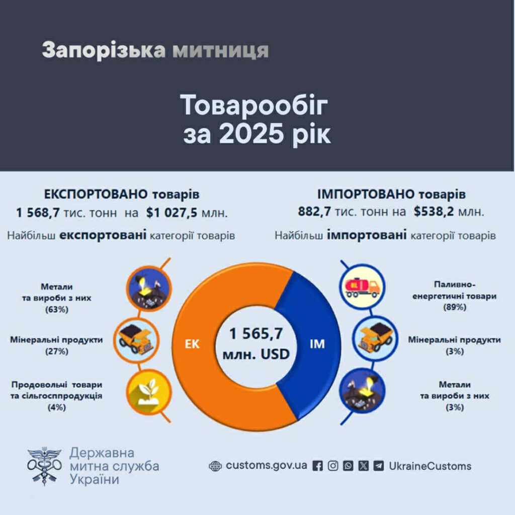 Зовнішньоторговельний товарообіг у зоні діяльності Запорізької митниці у 2025 році становив 1 565,7 млн доларів США.