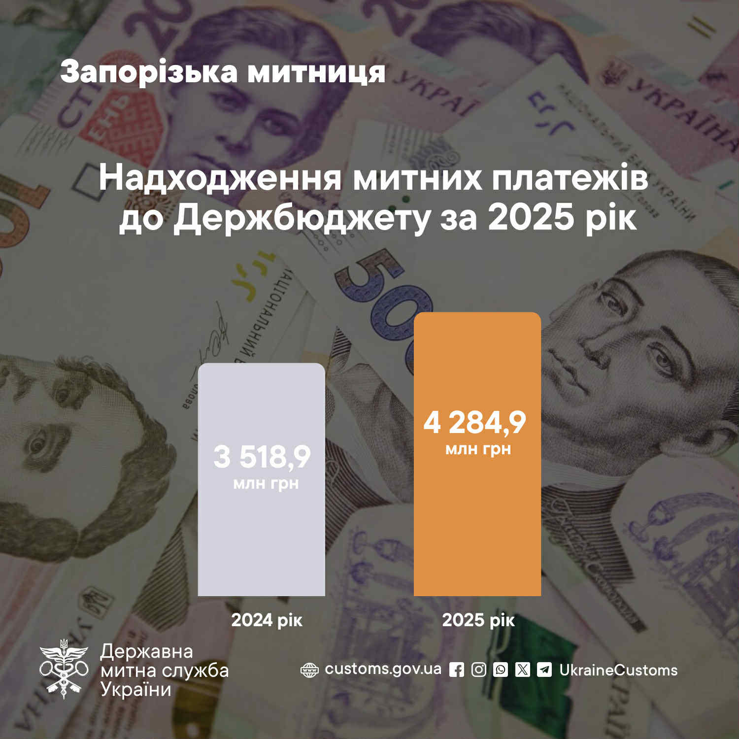 Загалом з початку 2025 року Запорізька митниця перерахувала до бюджету 4 млрд 284 млн 995,2 тис. грн, що на 766 млн 030,0 тис. грн (+21,8%) більше, ніж за аналогічний період 2024 року.