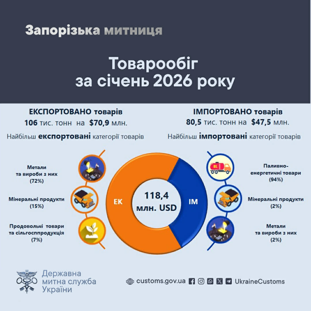 Попри складні умови воєнного часу підприємства Запорізького регіону продовжують працювати на зовнішніх ринках. У січні 2026 року зовнішньоторговельний товарообіг у зоні діяльності Запорізької митниці склав понад 118 млн доларів США, а митні надходження до держбюджету зросли майже на третину.