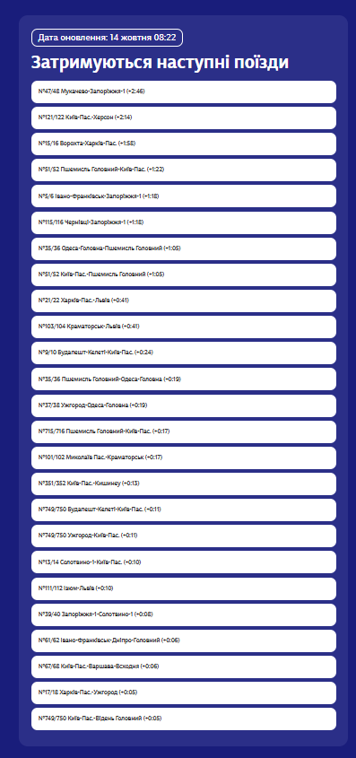 Загалом, станом на 08:22 14 жовтня затримуються понад два десятки пасажирських поїздів різних напрямків — як внутрішніх, так і міжнародних.