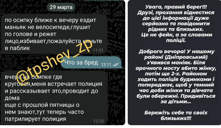 Саме після цього інциденту в місцевих пабліках і чатах почали з’являтися емоційні повідомлення із закликами не виходити ввечері на вулицю та бути особливо уважними. Частина таких публікацій містила неперевірені твердження, які швидко розійшлися мережею.