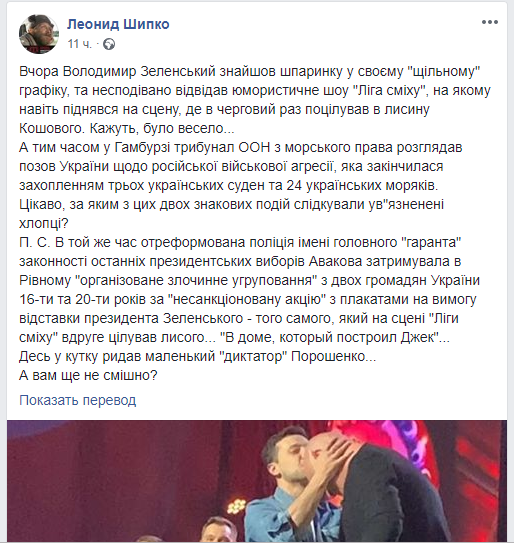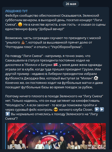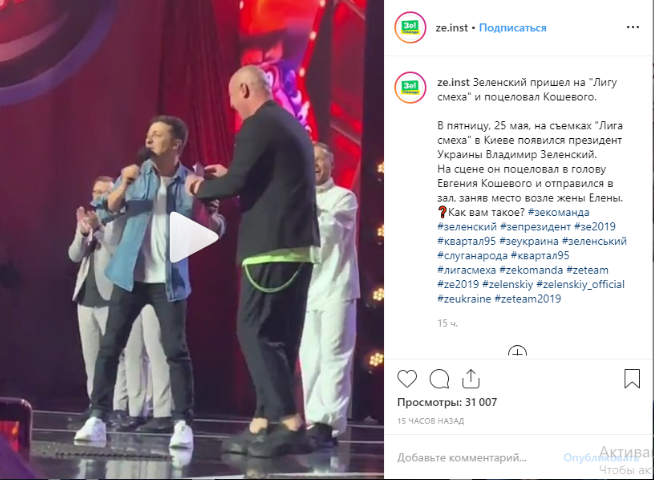Вечером, 25 мая, президент Владимир Зеленский выбежал сцену концерте юмористического проекта “Лига смеха”, который проходил в “Октябрьском дворце” в Киеве. Взял микрофон и сказал зрителям: “Добрий вечір. Більше слів у мене немає. Я вас люблю”. После, уже традиционно, поцеловал Евгения Кошевого в голову и передал микрофон бывшему коллеге по “Студии Квартал 95”. Вероятно, таким образом он дал всем понять, что ведущим юмористической программы теперь будет Кошевой.