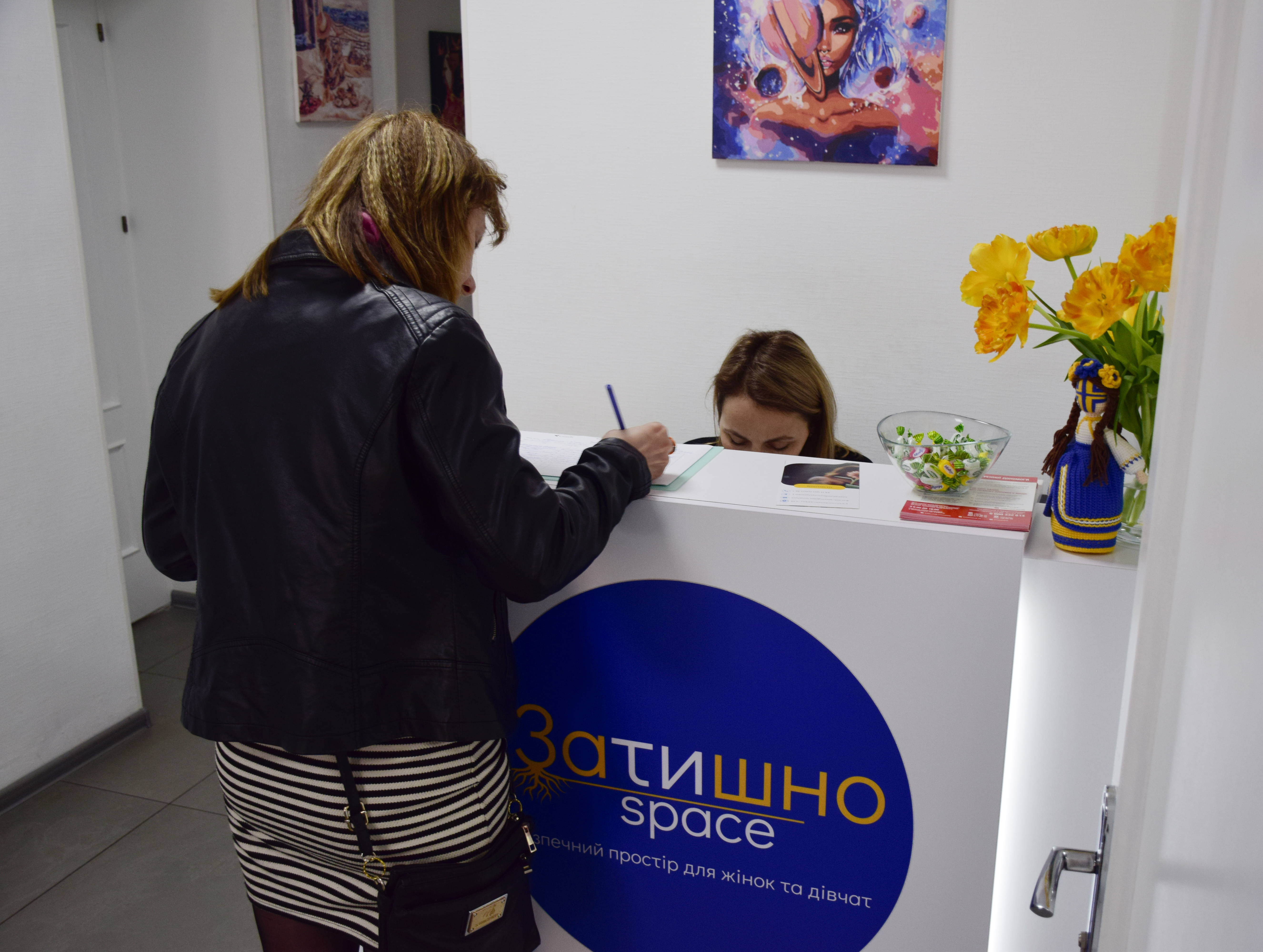 Я зайшла в освітлену приймальню організації “Затишно Space”. Крім привітної менеджерки мене зустріли картини, мапа України, де відвідувачки можуть наклеїти стікери до тієї області, звідки вони прибули, та інформаційний стенд з розкладом івентів у просторі та замітками, як уберегтися від різних проявів насильства.