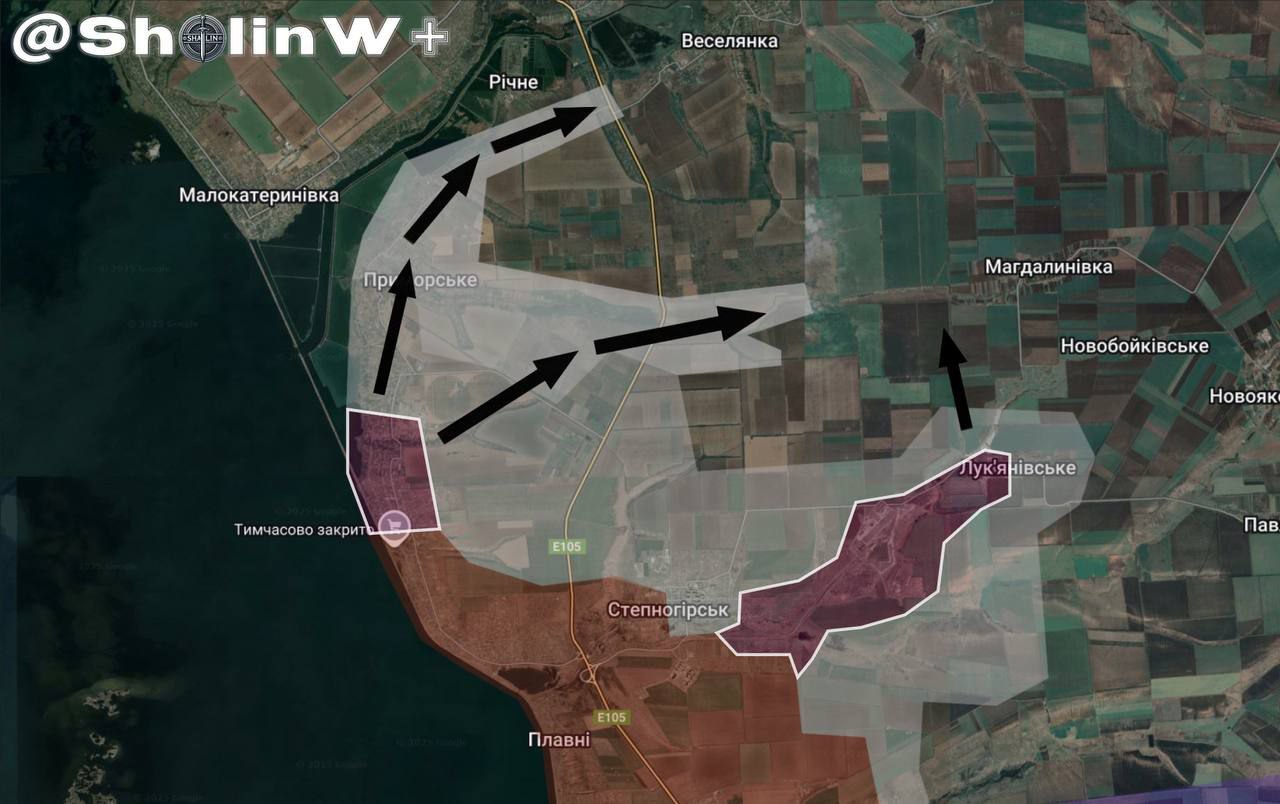 На Запорізькому напрямку російські війська продовжують тиск малими групами, намагаючись закріплюватися на нових позиціях і «просочуватися» вглиб української оборони. Найскладнішою, за повідомленням осінтера SHALIN, залишається ситуація південніше Лук’янівського, у районі Приморського, а також на підступах до Магдалинівки.
