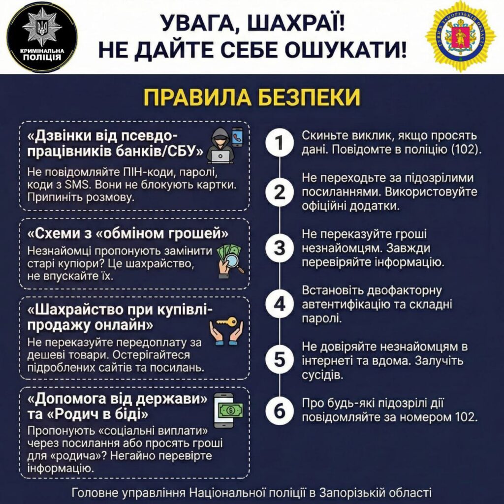 Шахраї дедалі частіше маскуються під працівників банків, поліції, СБУ або представників державних і міжнародних організацій. Вони виманюють гроші, персональні дані та отримують доступ до банківських карток. Поліція Запорізької обалсті нагадує: жодна офіційна установа не діє так, як діють аферисти.
