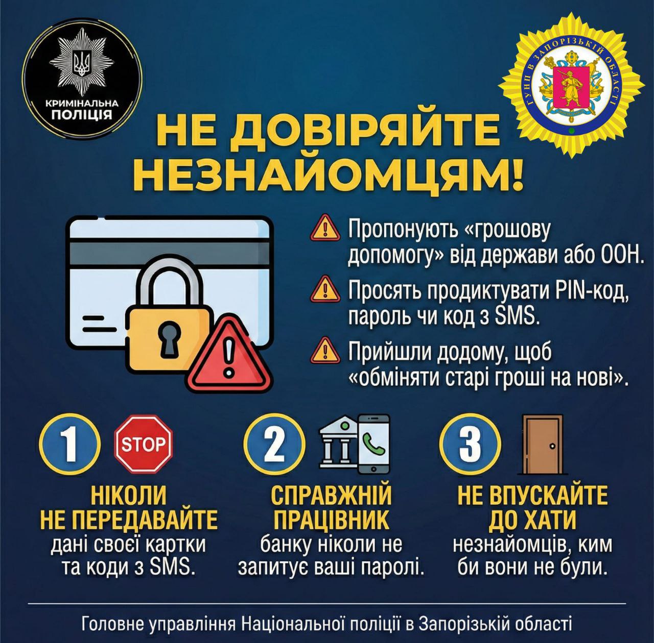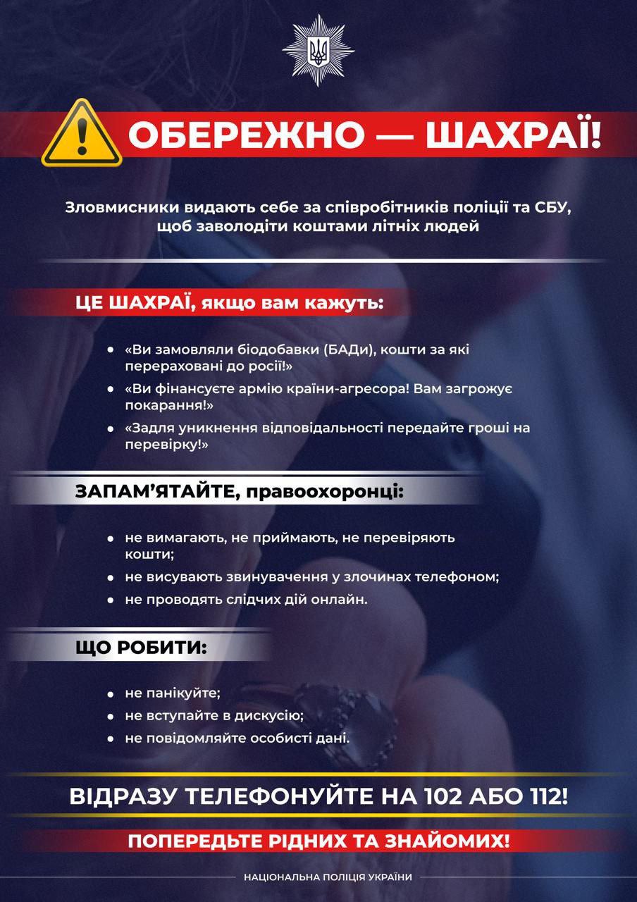 Шахраї дедалі частіше маскуються під працівників банків, поліції, СБУ або представників державних і міжнародних організацій. Вони виманюють гроші, персональні дані та отримують доступ до банківських карток. Поліція Запорізької обалсті нагадує: жодна офіційна установа не діє так, як діють аферисти.