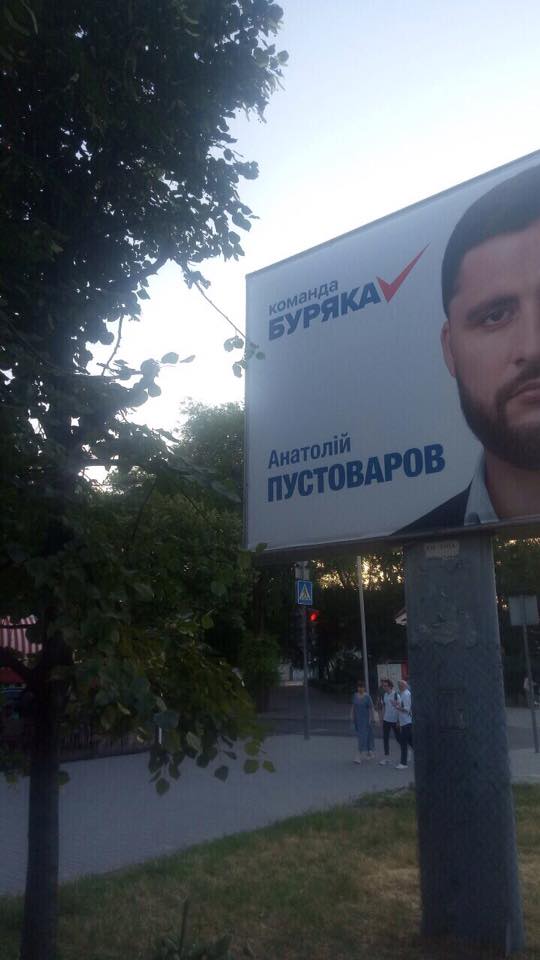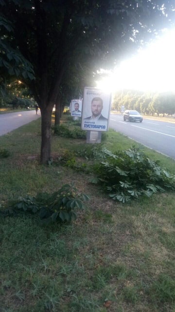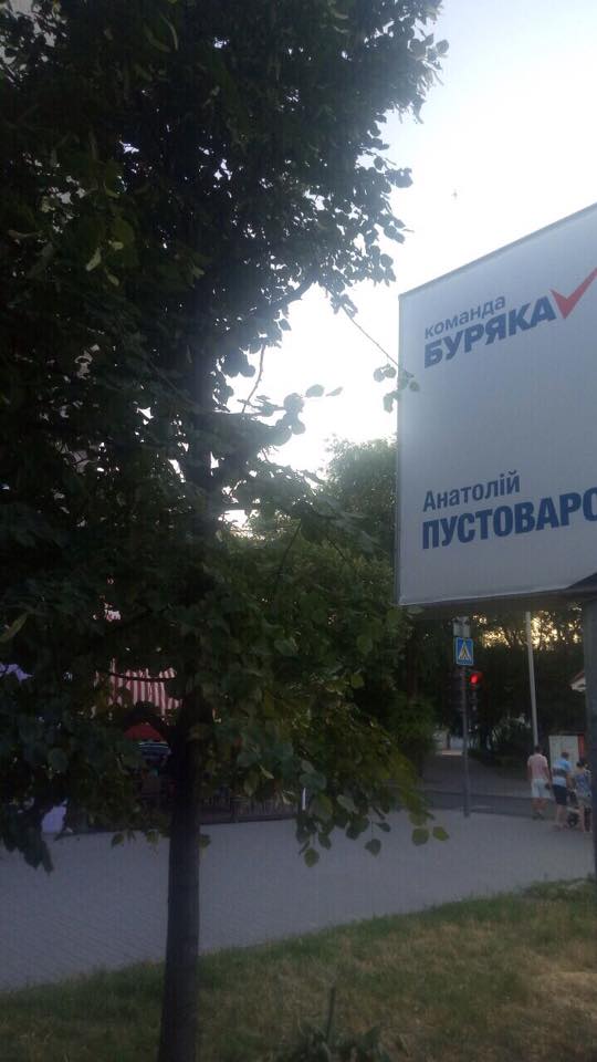 Пиар-кампания команды Буряка коснулась уже и городских деревьев. В сети появились снимки, на которых видно, что была спилена часть липы, чтобы было видно лицо Пустоварова.