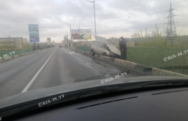 На первом путепроводе через реку Молочную автомобиль вылетел с проезжей части на пешеходную зону, перепрыгнув через отбойник.