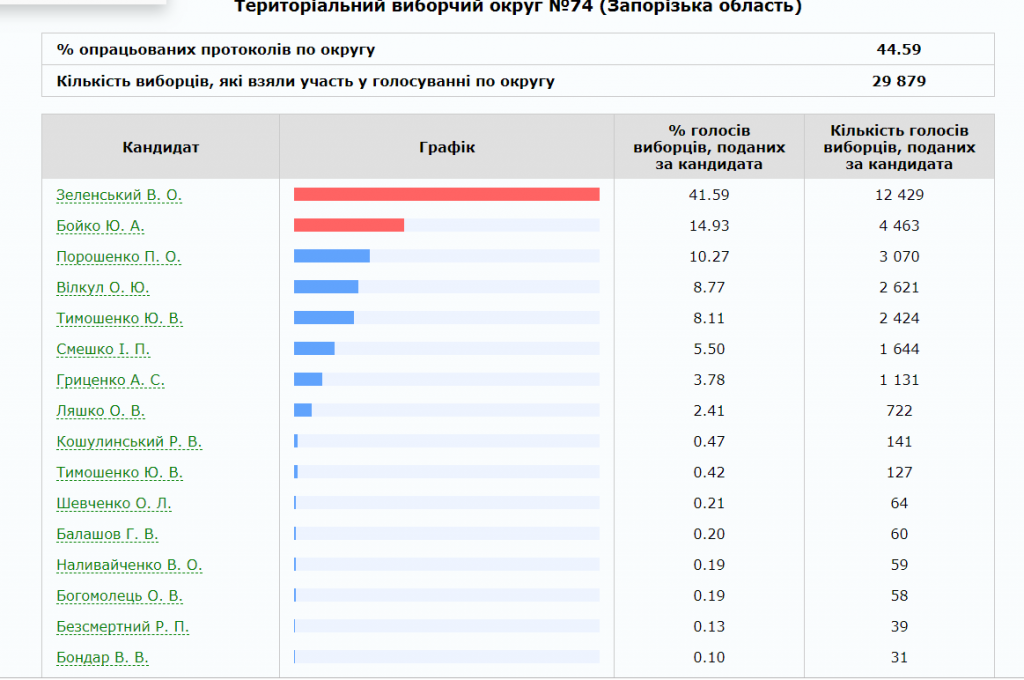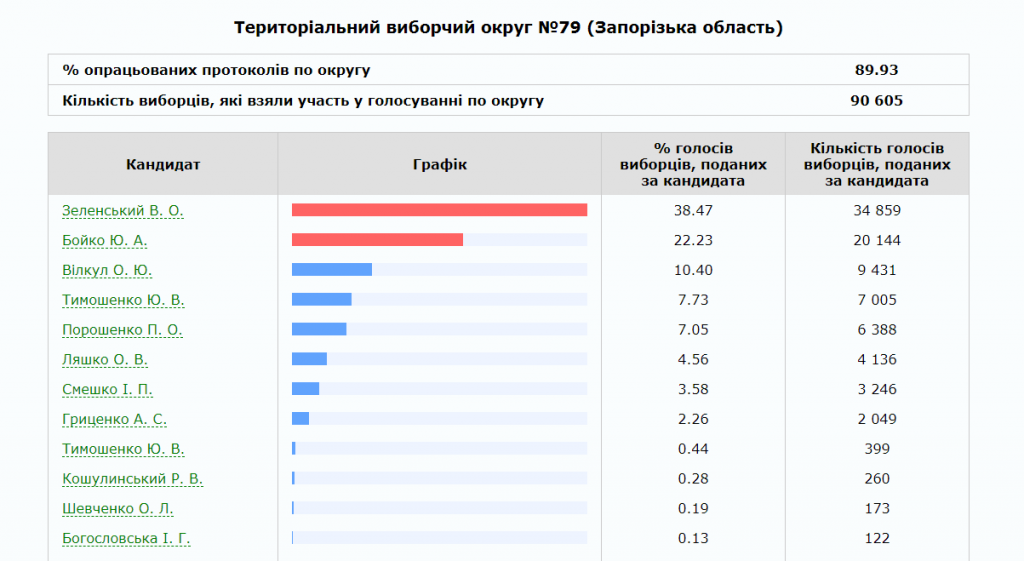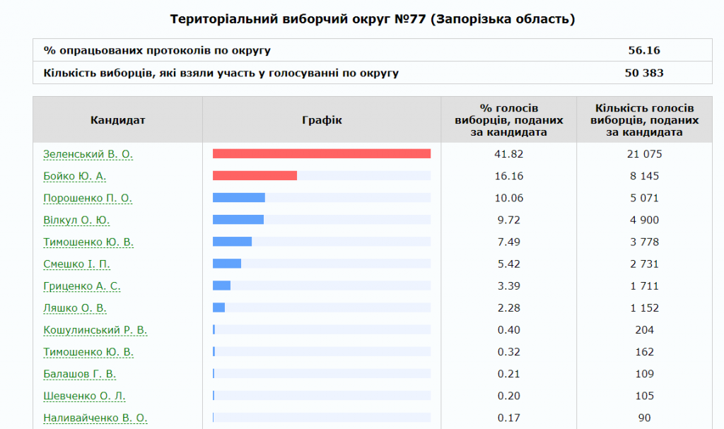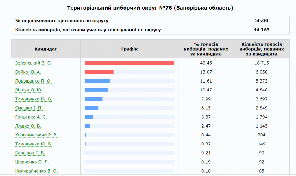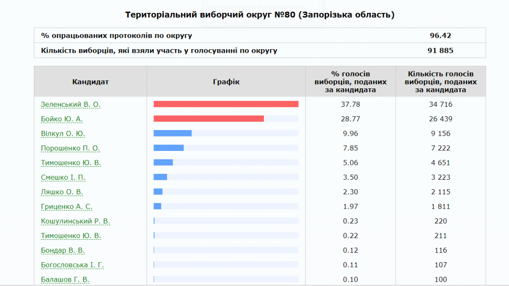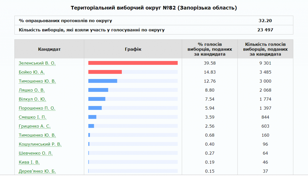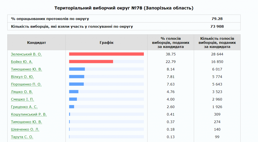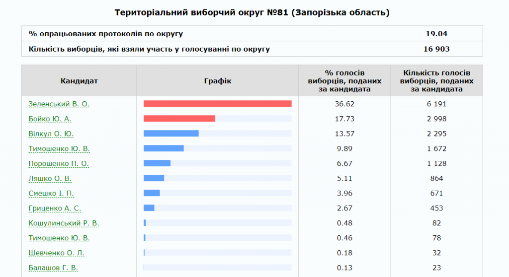 Что касается Запорожской области, то здесь также по всем округам лидером является Владимир Зеленский. На втором месте находится Юрий Бойко. Что касается Порошенко и Тимошенко, то у Петра Порошенко немного лучше позиции в округах г. Запорожья, а у Юлии Тимошенко – в округах области. Худшим для Порошенко оказался округ № 82 (с центром в Пологи), а для Тимошенко – округ № 80 с центром в Мелитополе.