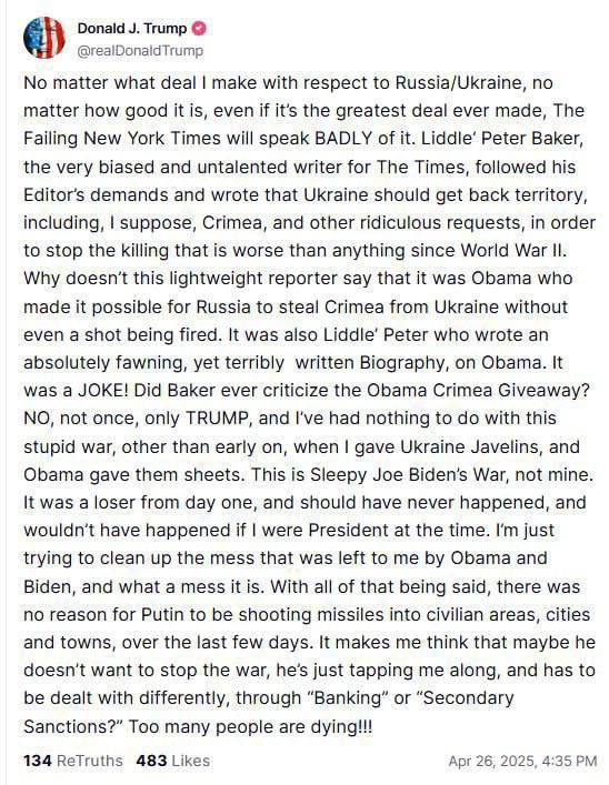 ‘Незалежно від того, яку угоду я укладу щодо Росії та України, якою б вигідною вона не була, навіть якщо це буде найкраща угода в історії, The *Failing New York Times все одно її критикуватиме. Пітер Бейкер, упереджений і безталанний журналіст The Times, виконуючи вказівки свого редактора, написав, що Україна повинна повернути території, включно, мабуть, із Кримом, та інші абсурдні вимоги, щоб зупинити вбивства, які, за його словами, є найгіршими з часів Другої світової війни.Чому цей легковажний репортер не згадує, що саме Обама дозволив Росії анексувати Крим без єдиного пострілу? Це також Пітер Бейкер написав абсолютно улесливу, але жахливо написану біографію Обами. Це було смішно! Чи критикував Бейкер коли-небудь Обаму за здачу Криму? Ні, жодного разу, лише Трампа, хоча я не маю нічого спільного з цією безглуздою війною, окрім того, що на початку я поставив Україні “Джавеліни”, тоді як Обама давав їм простирадла. Це війна Сонного Джо Байдена, а не моя. Вона була провальною від першого дня, і її не мало б статися, і не сталося б, якби я був президентом на той час. Я лише намагаюся розгребти той безлад, який залишили мені Обама і Байден, і що це за безлад! При цьому немає жодної причини, чому Путін останніми днями обстрілює ракетами цивільні райони, міста і селища. Це змушує мене думати, що, можливо, він не хоче зупиняти війну, а лише тягне час, і з ним потрібно діяти інакше — через “банківські” чи “вторинні санкції”? Занадто багато людей гине!!!”