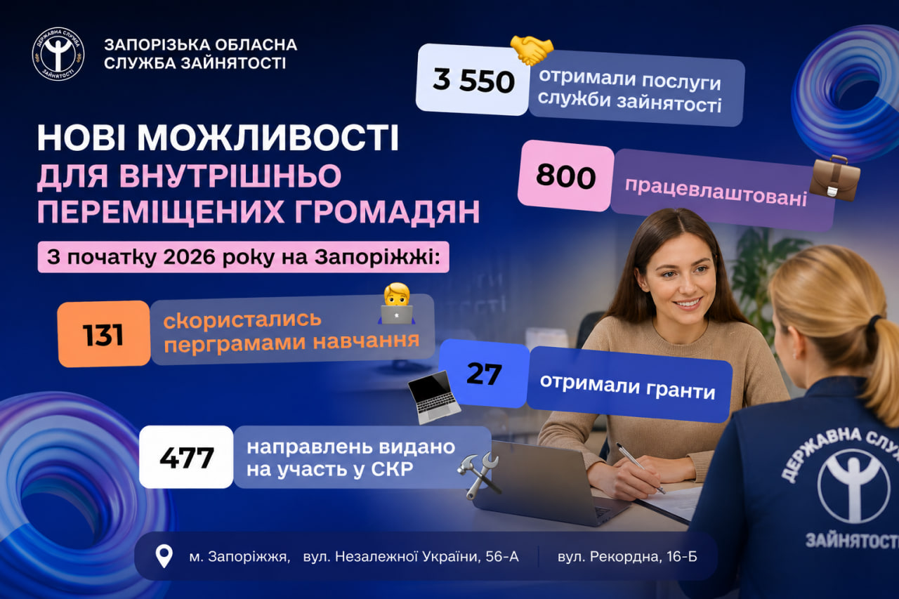 З початку 2026 року понад 3,5 тисячі внутрішньо переміщених осіб скористалися послугами Запорізької служби зайнятості. Серед них — сотні працевлаштованих, учасники навчальних програм та ті, хто відкрив власну справу.