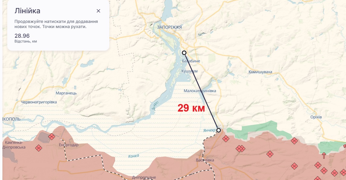 В одночас від найближчих позицій росіян в районі Кам’янського до Південного мікрорайону (Піски) у м. Запоріжжя всього близько 29 км. Якщо взяти найпівденнішу точку – селище Дослідницька Станція – то вийде ще менша відстань. До Космічного мікрорайону – теж близько 30 км.