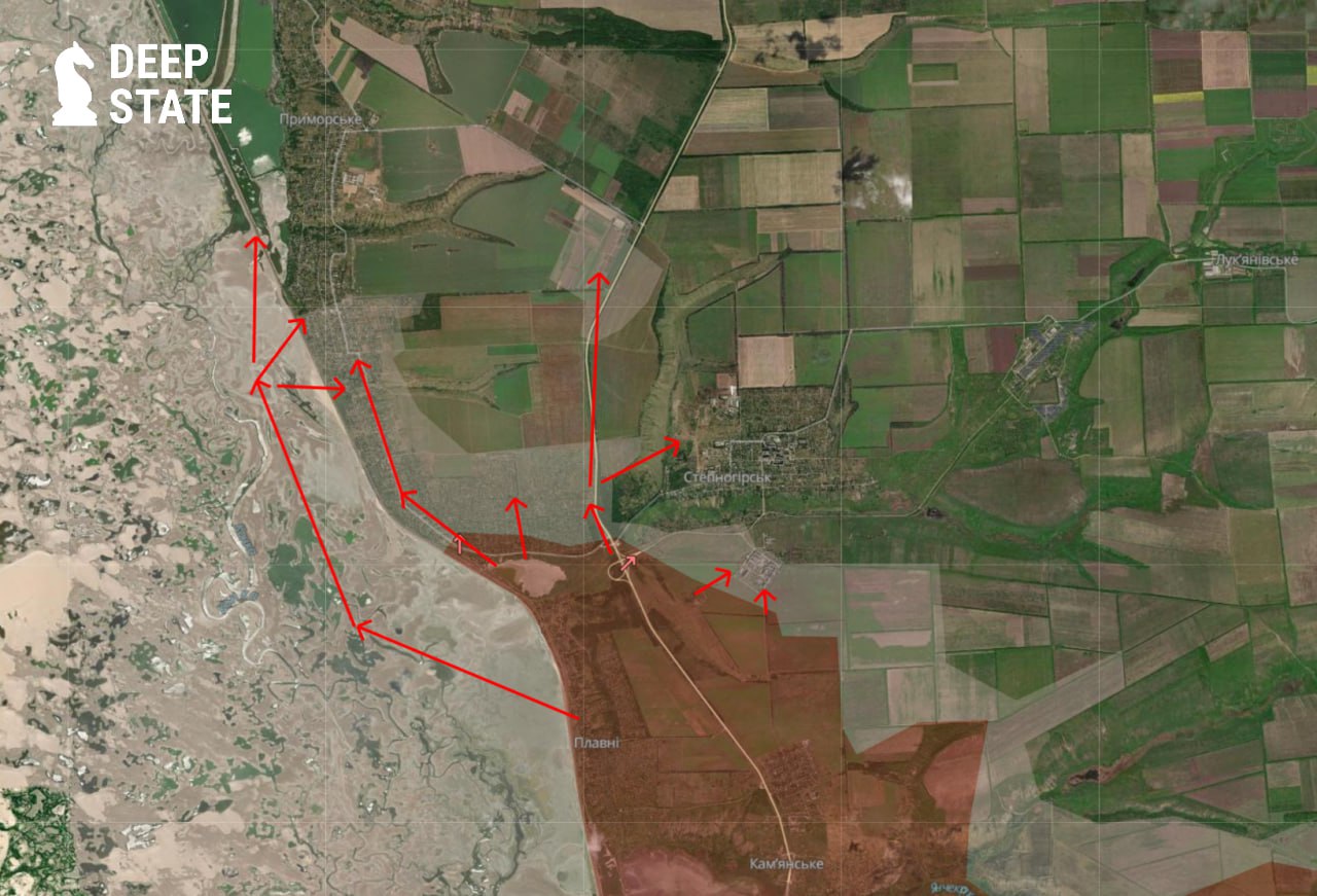 За інформацією осінт-аналітиків DeepState, російські війська продовжують штурмові дії у районі Приморського, просуваючись із боку Плавнів, а також намагаючись проникати у центральну частину населеного пункту диверсійними групами через русло Каховського водосховища.
