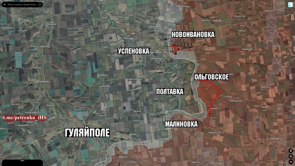- На південь від Новоіванівки противник просунувся вздовж лісосмуги та в районі фортифікаційних споруд на ділянці площею до 1.3 км² і продовжує штурмувати у напрямку Новомиколаївки та Нововасилевського, за якими розташована Успенівка, з якою російські війська планують у майбутньому посилити тиск на Гуляйполе