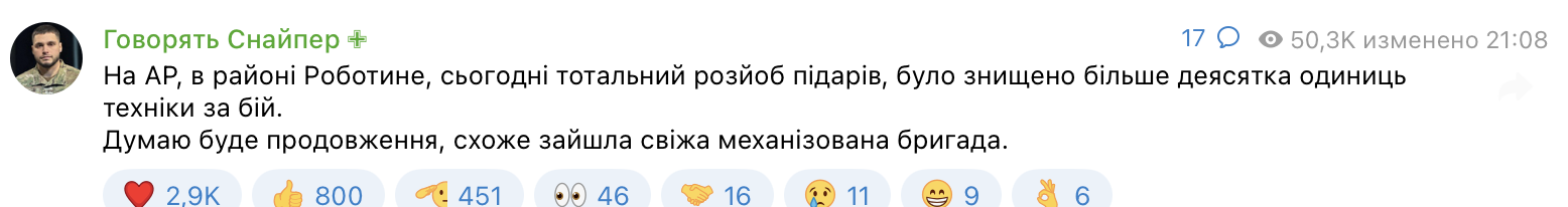 Командир відділення 24-го ШБ «Айдар», молодший сержант, автор телеграм-каналу «Говорять, снайпер» повідомив про розгром росіян на Запоріжжі.
