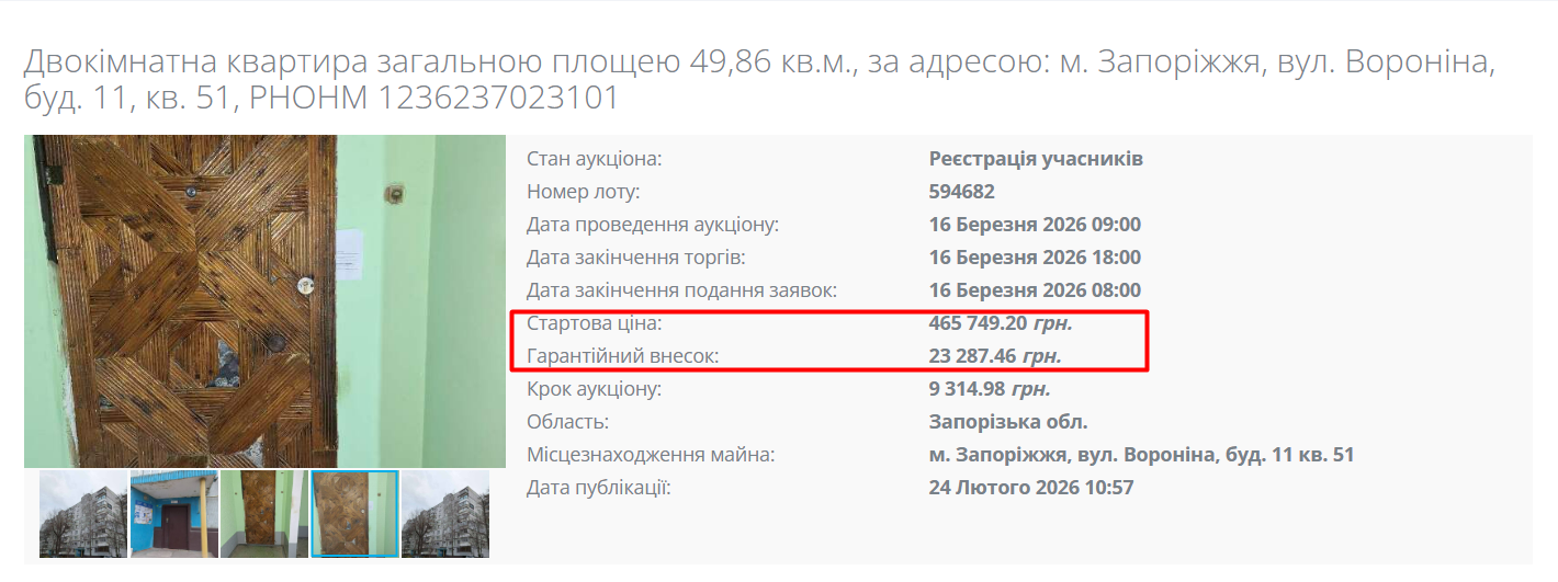 16 марта состоятся торги за двухкомнатную квартиру в Запорожье: подробности аукциона (ФОТО)