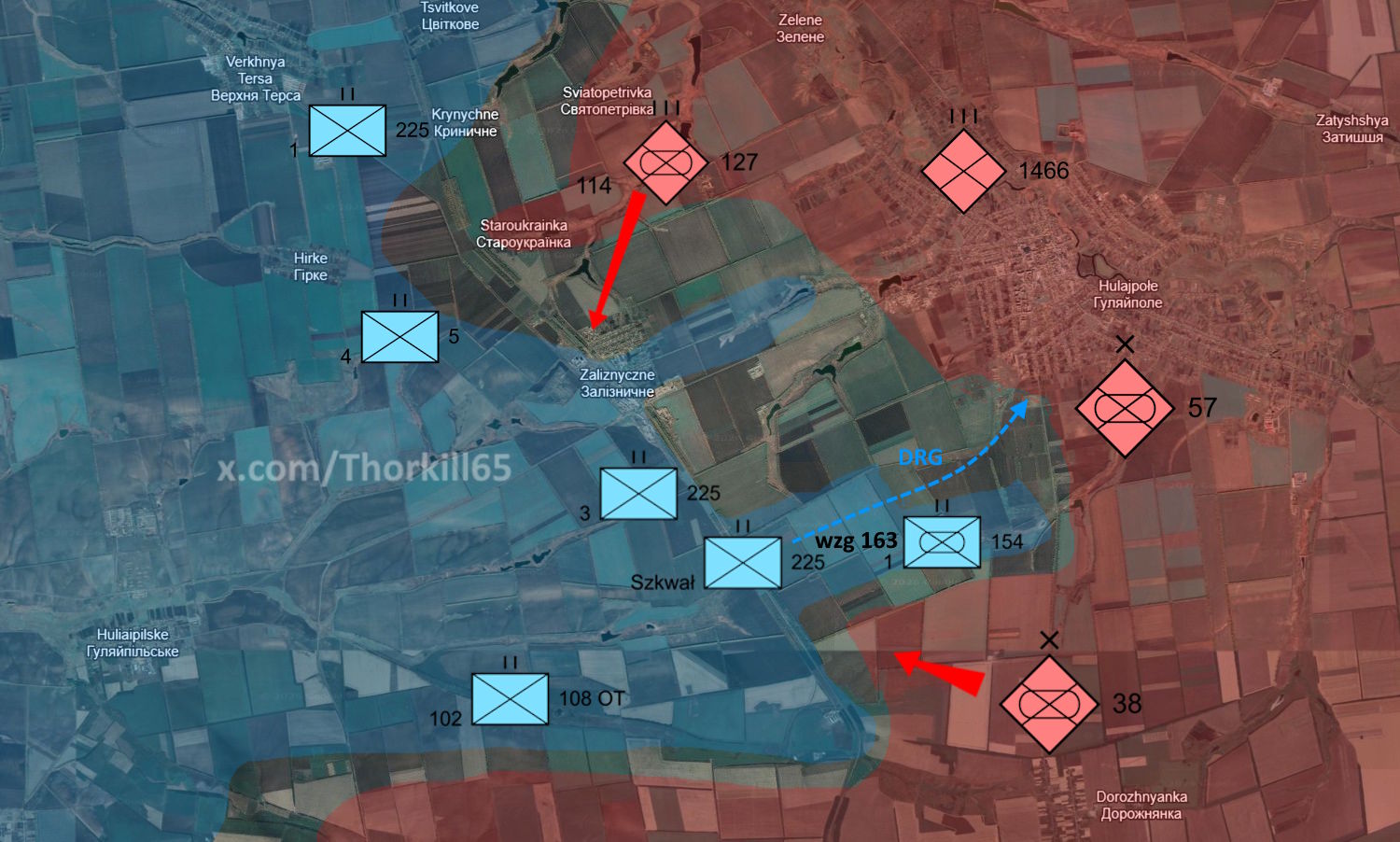Как отмечает Thorkill, в последние дни штурмовой батальон «Морок» 225-го штурмового полка ВСУ начал локальные наступательные действия к востоку от высоты 163. Целью могло быть проникновение в Гуляйполе со стороны дороги на Дорожнянку.